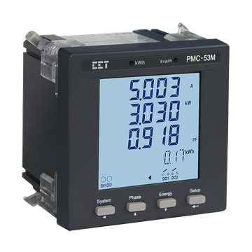 The PMC-53M Intelligent Multifunction Meter is CET’s latest offer for the low-cost digital power/energy metering market. Housed in an industry standard DIN form factor measuring 96mmx96mmx75mm, it is perfectly suited for industrial, commercial and utility metering applications. The PMC-53M features quality construction, multifunction measurements and a large, backlit, easy to read LCD display. Compliance with the IEC 62053-22 Class 0.5S kWh Accuracy Standard, it is a cost effective replacement for analog instrumentation, capable of displaying 3-phase measurements at once. It optionally provides two Digital Inputs for status monitoring and two Digital Outputs for control, alarm or energy pulsing applications. Further, it has optional inputs for I residual as well as RTD temperature measurements for fire alarm monitoring, transformer temperature monitoring or other applications. The standard SOE Log records all setup changes, DI/Setpoint status changes and DO operations in 1ms resolution. With the standard RS485 port and Modbus protocol support, the PMC-53M becomes a vital component of an intelligent, multifunction monitoring solution for any Power and Energy Management systems.