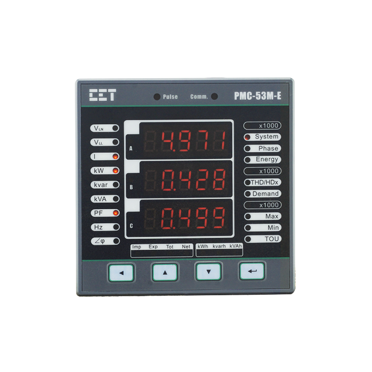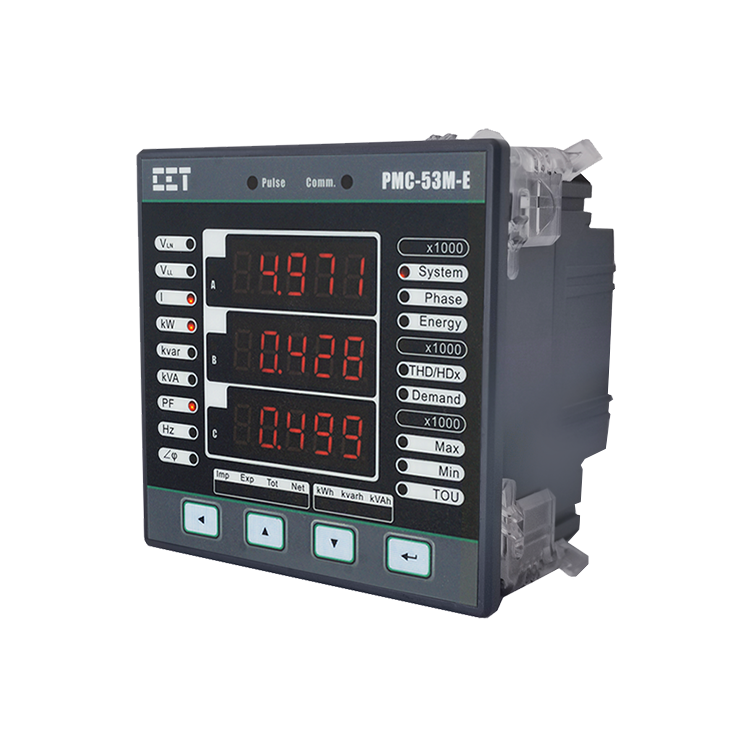 PMC-53M-A and PMC-53M-E are CET’s latest offer for the low-cost Multifunction Digital Meter. Housed in a standard DIN form factor measuring 96x96x88mm, Compliance with the IEC62053-22 Class 0.5S Standard, they are cost effective replacements for 3-phase analog meters and perfectly suited for industrial, commercial and utility applications for power and energy measurement. PMC-53M-A features a large, backlit, 7-segment LCD display while the PMC-53M-E features a high-contrast LED display. Both optionally provide four Digital Inputs for status monitoring, two Relay Outputs for control and alarm applications as well as one standard RS-485 port with Modbus RTU Protocol support. These features make them the most affordable smart metering devices for any Energy Management System.PMC-53M-AE Catalogue (20210707S)